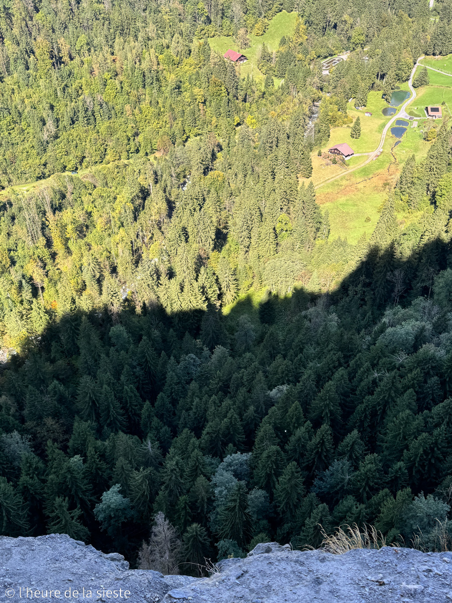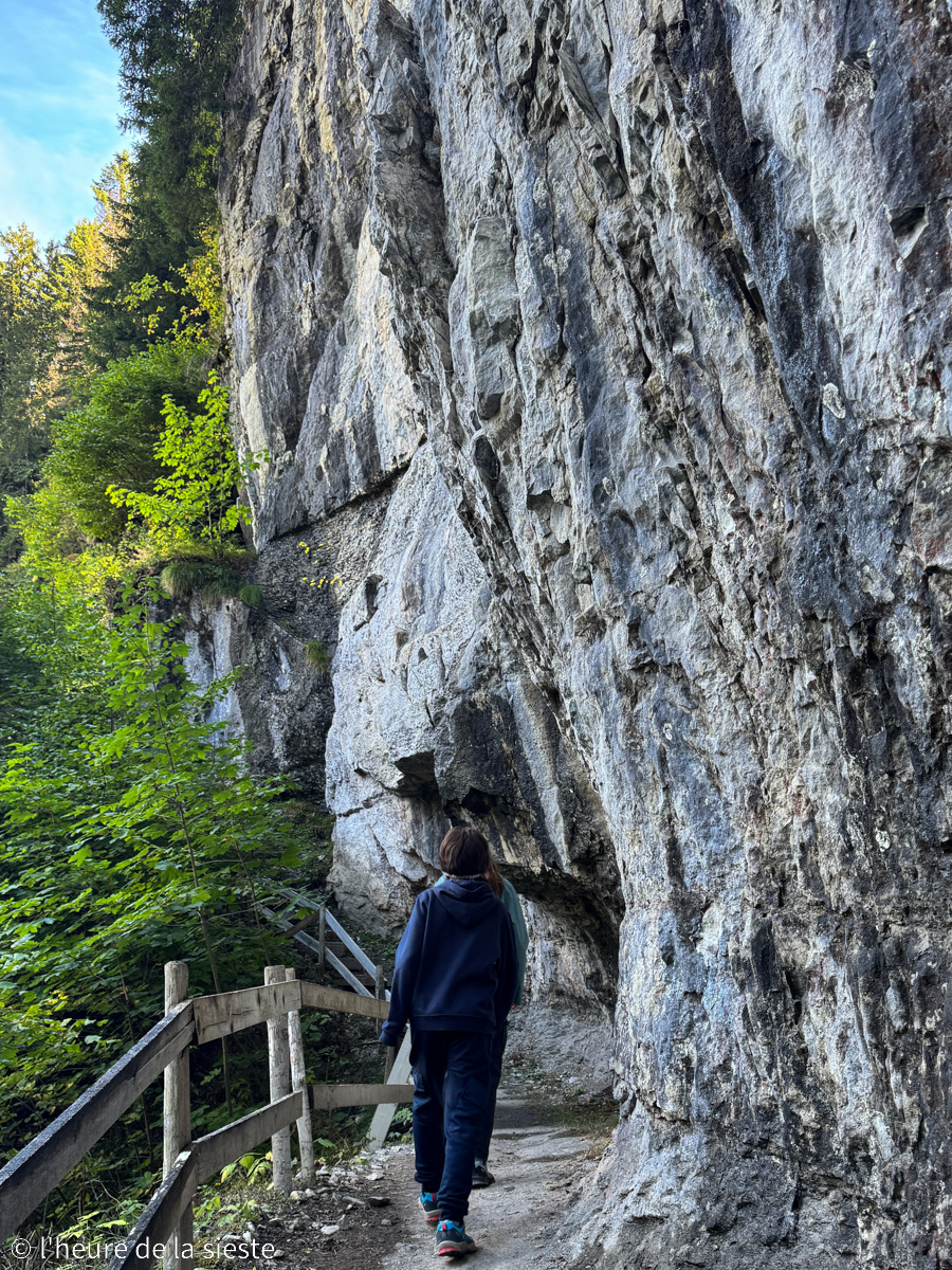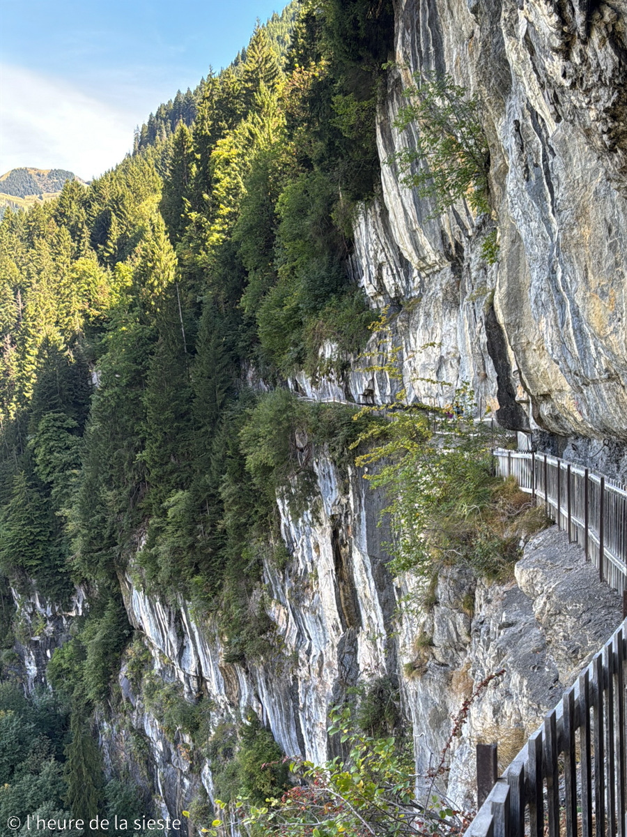 Blotti dans la paroi calcaire des Rives, ce chemin creusé à flanc de montagne offre une vue spectaculaire sur la vallée et sur le village de Champéry. C’est assez impressionnant ! Le sentier est sécurisé, mais il faut tout de même rester prudent : certaines sections sont étroites, un peu glissantes et parfois surplombées de roches basses. Le vertige peut se faire sentir à certains endroits, donc à éviter si vous n’êtes pas à l’aise avec la hauteur.